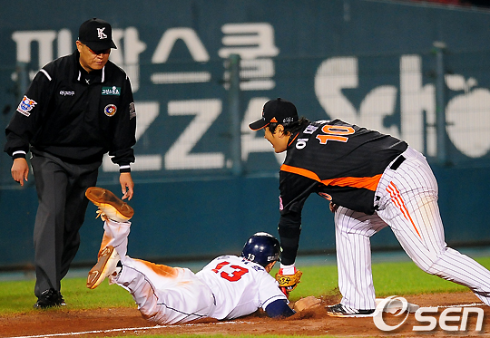 29일 잠실구장에서 열리는 '2010 CJ마구마구 프로야구' 준플레이오프 1차전 두산 베어스와 롯데 자이언츠의 경기, 3회말 1사 1,2루에서 두산 고영민의 내야땅볼에 협살에 걸린 2루 주자 손시헌이 3루에서 롯데 이대호에 태그아웃당하고 있다. / jpnews@osen.co.kr