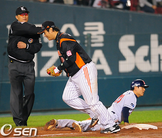 29일 잠실구장에서 열리는 '2010 CJ마구마구 프로야구' 준플레이오프 1차전 두산 베어스와 롯데 자이언츠의 경기, 3회말 1사 1,3루에서 두산 고영민의 내야땅볼에 롯데 이대호가 협살에 걸린 손시헌을 태그아웃하며 덕아웃으로 향하고 있다. / jpnews@osen.co.kr