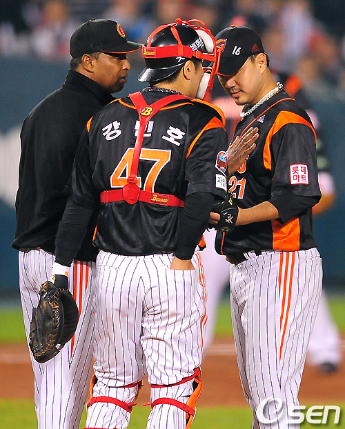 29일 잠실구장에서 열리는 '2010 CJ마구마구 프로야구' 준플레이오프 1차전 두산 베어스와 롯데 자이언츠의 경기, 6회말 1사 2루에서 롯데 송승준이 두산 임재철이 동점 1타점 적시타를 허용하고 로이스터 감독의 격려를 받으며 강판당하고 있다. / jpnews@osen.co.kr