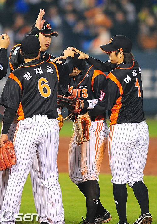 경기후 롯데 선수들이 결승 솔로포를 날린 전준우 머리를 때리며 승리를 축하하고 있다. / jpnews@osen.co.kr