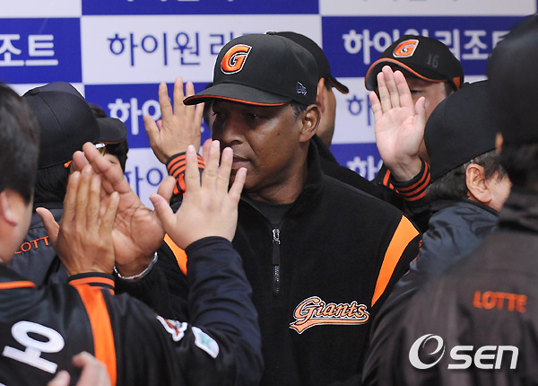 승리가 확정되자 롯데 로이스터 감독이 스태프들의 축하 받고 있다./soul1014@osen.co.kr
