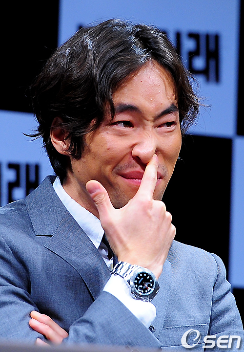 류승범이 간담회 도중 코를 만지며 얼굴을 찡그리고 있다. / jpnews@osen.co.kr