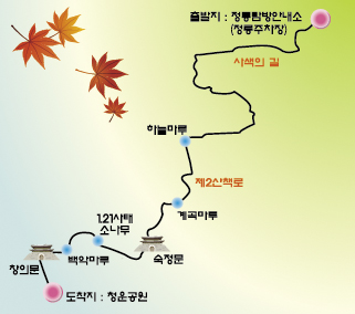둘레길~성곽 이어걷기는 북한산 정릉탐방안내소에서 출발하여 사색의 길~하늘마루~제2산책로(일명 김신조 루트)~숙정문~1․21사태 소나무~백악마루~창의문~윤동주 시인 언덕길~청운공원(총 7km)으로 이어지는 북악산의 진수를 볼 수 있는 코스입니다. 특히 김신조 루트는 41년만에 개방되어 북악산의 속살을 고스란히 간직하고 있습니다.