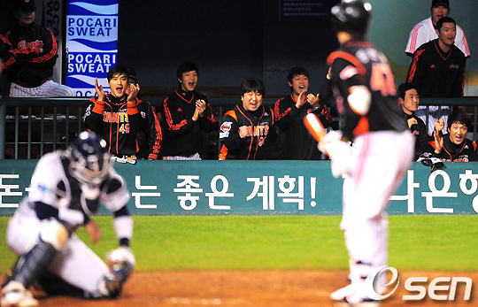 30일 잠실구장에서 열린 '2010 CJ마구마구 프로야구' 준플레이오프 2차전 두산 베어스와 롯데 자이언츠의 경기, 4회초 1사 만루에서 롯데 강민호가 두산 김선우의 사구에 맞아 밀어내기로 선취 득점에 성공하자 덕아웃에서 박수를 치며 기뻐하고 있다. / jpnews@osen.co.kr