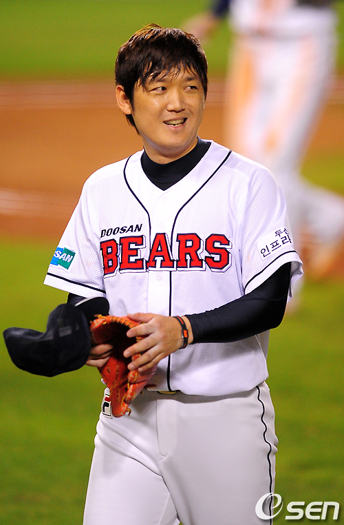 30일 잠실구장에서 열린 '2010 CJ마구마구 프로야구' 준플레이오프 2차전 두산 베어스와 롯데 자이언츠의 경기, 4회초 1사 만루에서 롯데 강민호에 사구로 밀어내기를 허용한 두산 김선우가 수비를 마치고 허탈한 미소를 지으며 덕아웃으로 향하고 있다. / jpnews@osen.co.kr