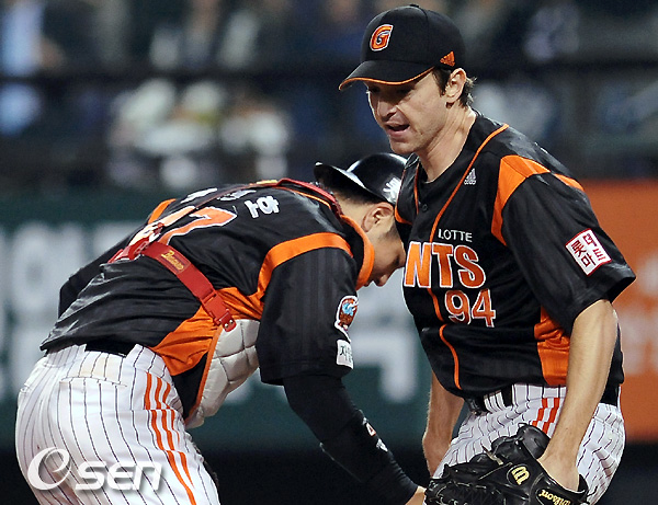 30일 잠실구장에서 열리는 '2010 CJ마구마구 프로야구' 준플레이오프 2차전 두산 베어스와 롯데 자이언츠의 경기에 6회말 2사 2루 두산 손시헌의 외야안타때 2루 주자 양의지가 홈에서 태그아웃됐다. 실점을 저지한 롯데 사도스키와 강민호가 환호하고 있다 / soul1014@osen.co.kr