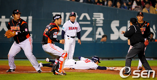 30일 잠실구장에서 열린 '2010 CJ마구마구 프로야구' 준플레이오프 2차전 두산 베어스와 롯데 자이언츠의 경기, 7회말 1사 1,3루에서 두산 김현수의 내야땅볼에 협살에 걸린 이종욱이 롯데 이대호에 태그아웃당하고 심판 판정을 바라보고 있다. / jpnews@osen.co.kr