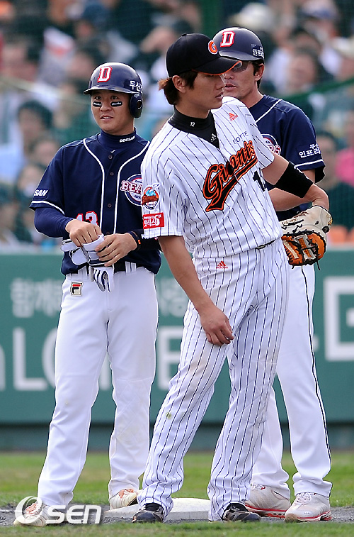 2일 부산 사직구장에서 열리는 '2010 CJ마구마구 프로야구' 준플레이오프 3차전 롯데 자이언츠와 두산 베어스의 경기 4회초 무사 만루 두산 손시헌이 내야땅볼때 롯데 이대호의 실책으로 2타점을 올린 후 김민호 코치와 이야기를 나누고 있다. / soul1014@osen.co.kr
