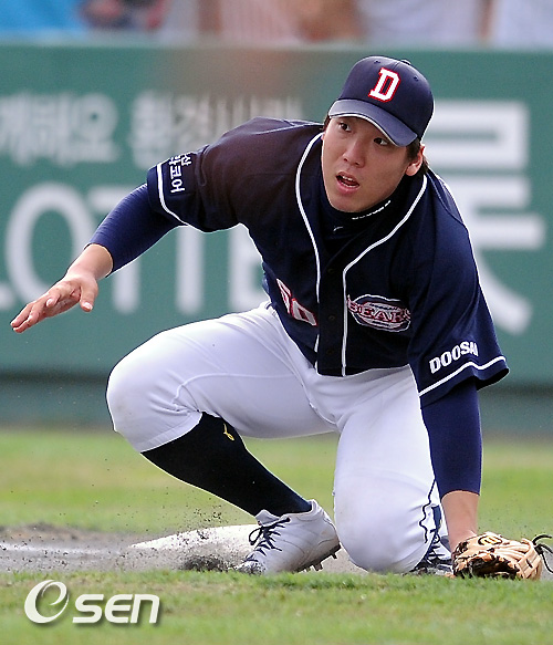 2일 부산 사직구장에서 열리는 '2010 CJ마구마구 프로야구' 준플레이오프 3차전 롯데 자이언츠와 두산 베어스의 경기 5회말 1사 2루 롯데 조성환의 내야안타때 김현수 1루수가 공을 놓치고 있다. 그 사이 2루 주자 김주찬은 홈을 들어왔다 / soul1014@osen.co.kr