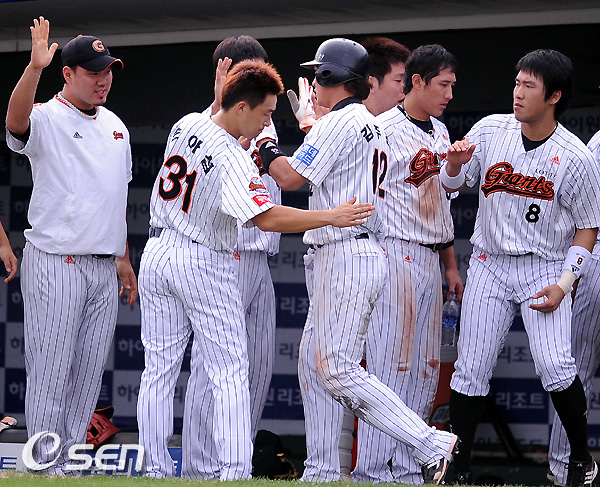 2일 부산 사직구장에서 열리는 '2010 CJ마구마구 프로야구' 준플레이오프 3차전 롯데 자이언츠와 두산 베어스의 경기 5회말 1사 2루 롯데 조성환의 내야안타때 김현수 1루수가 공을 놓치는 사이 2루 주자 김주찬이 홈을 밟은 후 환영을 받고 있다. / soul1014@osen.co.kr