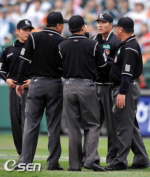 2일 부산 사직구장에서 열리는 '2010 CJ마구마구 프로야구' 준플레이오프 3차전 롯데 자이언츠와 두산 베어스의 경기 6회말 2사 롯데 전준우의 타구가 좌익수 상공의 깃발에 맞자 야수가 잡을 수 있는 것으로 심판진 합의 끝에 판정, 아웃 을 선언했다. 심판들이 모여 판정에 대해 이야기를 나누고 있다. / soul1014@osen.co.kr