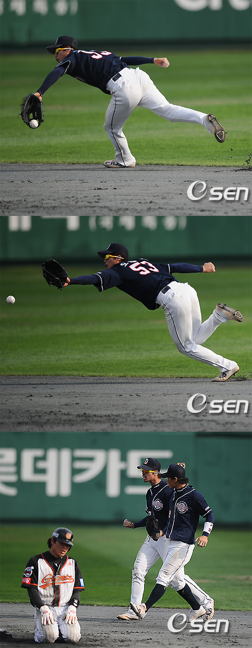 3일 부산 사직 경기장에서 열린 '2010 CJ 마구마구 프로야구 준플레이오프 4차전' 두산 베어스와 롯데 자이언츠 경기 4회말 2사 1,2루 조성환의 2루수앞 안타성 타구를 두산 오재원 2루수가 글러브로 잡아서 2루에서 포스아수 아웃처리 시키고 환호하고 있다./ ajyoung@osen.co.kr