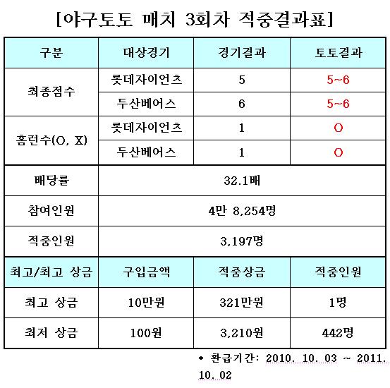체육진흥 투표권 수탁사업자인 스포츠토토(www.sportstoto.co.kr)는 지난 2일 벌어진 2010시즌 프로야구 준플레이오프 3차전 롯데 자이언츠와 두산 베어스의 경기를 대상으로 발매한 야구토토 매치 3회차 게임 결과 모두 3197명의 참가자가 6대5 두산의 승리(홈런 두산O, 롯데X)를 정확히 예측해 무더기 적중자를 배출했다고 밝혔다.