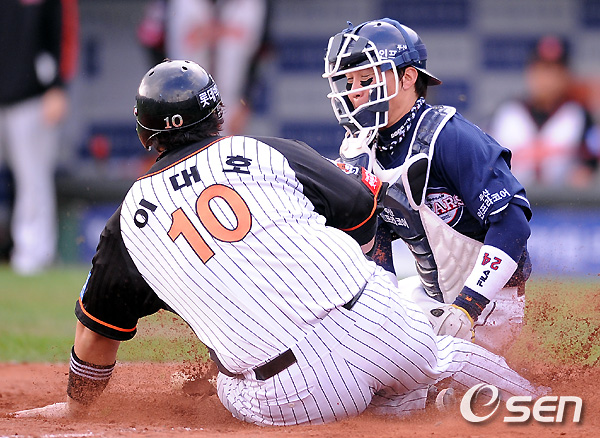 3일 부산 사직구장에서 열린 '2010 CJ마구마구 프로야구' 준플레이오프 4차전 롯데 자이언츠와 두산 베어스의 경기 5회말 무사 1,2루 롯데 가르시아의 중견수 앞에 떨어지는 안타때 2루 주자 이대호가 홈 쇄도해 두산 용덕한 포수에게 태그아웃되고 있다. / soul1014@osen.co.kr