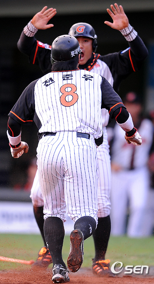3일 부산 사직구장에서 열린 '2010 CJ마구마구 프로야구' 준플레이오프 4차전 롯데 자이언츠와 두산 베어스의 경기 5회말 2사 2,3루 롯데 강민호의 좌익수 앞에 떨어지는 2타점 적시타때 2,3루 주자 홍성흔과 전준우가 하이파이브를 하고 있다. / soul1014@osen.co.kr