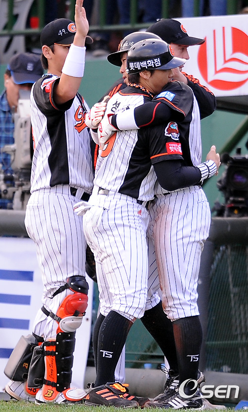 3일 부산 사직구장에서 열린 '2010 CJ마구마구 프로야구' 준플레이오프 4차전 롯데 자이언츠와 두산 베어스의 경기 5회말 2사 2,3루 롯데 강민호의 좌익수 앞에 떨어지는 2타점 적시타때 2,3루 주자 홍성흔과 전준우가 포옹을 하고 있다. / soul1014@osen.co.kr
