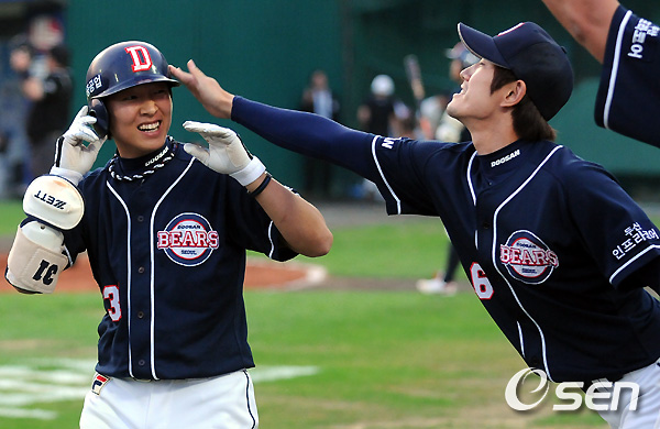 3일 부산 사직구장에서 열린 '2010 CJ마구마구 프로야구' 준플레이오프 4차전 롯데 자이언츠와 두산 베어스의 경기 9회초 1사 2,3루 두산 고영민 대타로 타석에 들어선 정수빈이 우월 3점 홈런을 날린뒤 덕아웃에서 환영을 받고 있다. / soul1014@osen.co.kr
