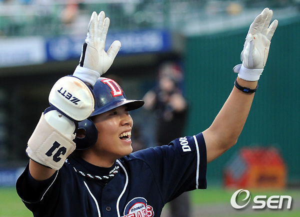 3일 부산 사직구장에서 열린 '2010 CJ마구마구 프로야구' 준플레이오프 4차전 롯데 자이언츠와 두산 베어스의 경기 9회초 1사 2,3루 두산 고영민 대타로 타석에 들어선 정수빈이 우월 3점 홈런을 날린뒤 팬들에게 인사를 하고 있다 / soul1014@osen.co.kr