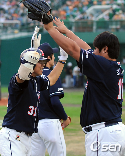 3일 부산 사직구장에서 열린 '2010 CJ마구마구 프로야구' 준플레이오프 4차전 롯데 자이언츠와 두산 베어스의 경기 9회초 1사 2,3루 두산 고영민 대타로 타석에 들어선 정수빈이 우월 3점 홈런을 날린뒤 최준석의 환영을 받고 있다. / soul1014@osen.co.kr