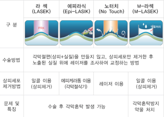 두 번째 방법중 레이저를 이용한 시력교정수술은 크게 라식과 라섹으로 분류된다. 라식이란 칼이나 레이저를 이용하여 각막의 실질부위를 잘라내어 각막절편을 만들어 젖힌 후에 표출된 각막실질에 레이저를 조사하여 시력을 교정하는 방법이고, 라섹은 약물을 이용하여 각막의 상피만을 제거한 뒤 표출된 각막실질에 레이저를 조사하여 시력을 교정하는 방법이다.