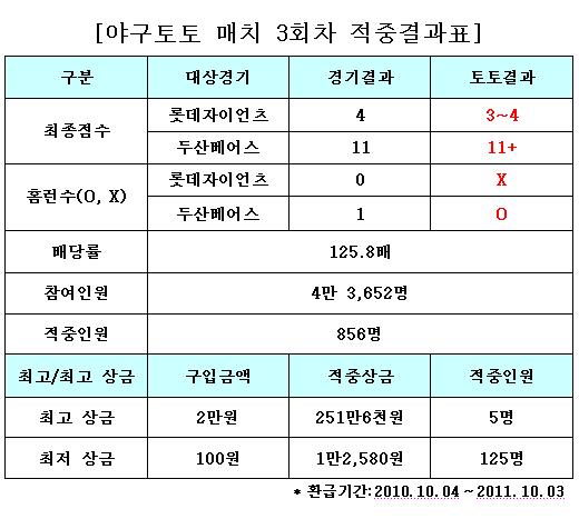 체육진흥투표권 수탁사업자인 스포츠토토(www.sportstoto.co.kr)는 지난 3일에 부산사직구장에서 벌어진 2010시즌 프로야구 준플레이오프 4차전 롯데와 두산의 경기를 대상으로 발매한 야구토토 매치 4회차 게임에서 모두 856명의 참가자가 4-11 두산 승리 및 홈런수(롯데 X, 두산O)를 정확히 맞혔다고 밝혔다.