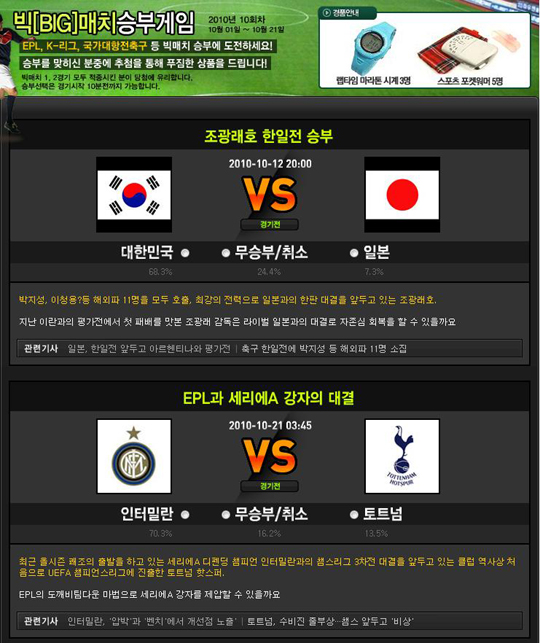 대한민국-일본, 인터밀란-토트넘전 대상 빅매치 1, 2경기 승부 맞히기