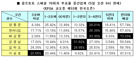 KGT투어 상금 순위 3위에 올라 있는 강경남이 59.54%로 2순위를 차지했고, 양용은, 앤서니김, 김비오가 각각 57.74%, 57.43%, 56.75%로 뒤를 이었다. 반면 이승호는 47.61%로 가장 저조한 투표율을 기록했다.