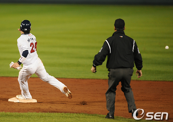 5일 잠실 경기장에서 열린 '2010 CJ 마구마구 프로야구 준플레이오프 5차전' 두산 베어스와 롯데 자이언츠 경기 6회말 2사 1,3루 이종욱 타석때 1루 주자 용덕한 2루 도루때 롯데 내야진의 수비 실책으로 2루 도루에 성공하고 있다./ ajyoung@osen.co.kr