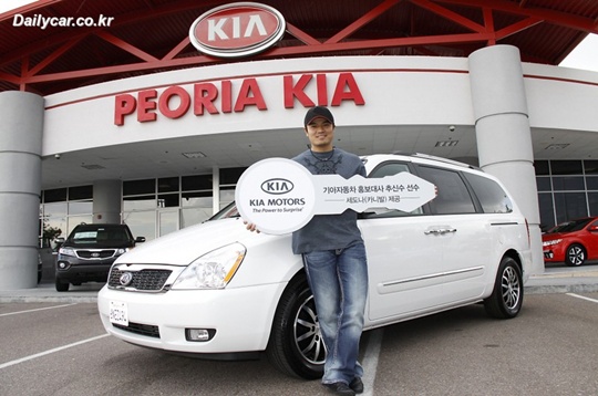 기아자동차는 5일(현지시간) 미국 아리조나주 기아차 딜러점인 피오리아 기아에서 추신수 선수, 호헤 캠블 피닉스지역 판매담당 책임자 등이 참석한 가운데 추신수 선수가 미국 활동 시 이용할 그랜드카니발(수출명 세도나)을 전달했다.
