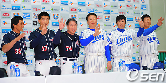 6일 오후 대구시민운동장 실내체육관 기자회견장에서 열린 2010 프로야구 플레이오프 미디어데이에서 두산 김경문 감독과 삼성 선동열 감독을 비롯한 대표 선수들이 예상 경기수를 손가락으로 표시하며 포토타임을 갖고 있다.