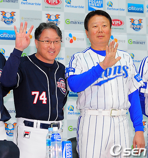 6일 오후 대구시민운동장 실내체육관 기자회견장에서 열린 2010 프로야구 플레이오프 미디어데이에서 두산 김경문 감독과 삼성 선동열 감독이 예상 경기수를 손가락으로 가리키고 있다.