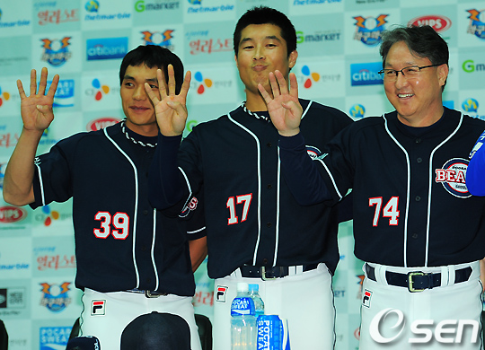 6일 오후 대구시민운동장 실내체육관 기자회견장에서 열린 2010 프로야구 플레이오프 미디어데이에서 두산 이종욱 임재철과 김경문 감독이 포토타임을 갖고 있다.