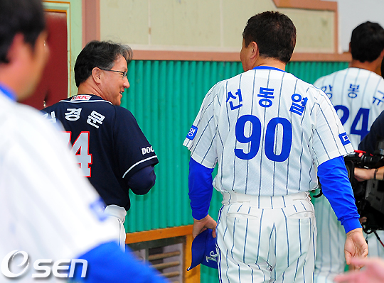 6일 오후 대구시민운동장 실내체육관에서 열린 2010 프로야구 플레이오프 미디어데이를 마치고 두산 김경문 감독과 삼성 선동열 감독이 이야기를 나누며 회견장을 나서고 있다.