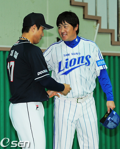 6일 오후 대구시민운동장 실내체육관 기자회견장에서 열린 2010 프로야구 플레이오프 미디어데이에서 두산 임재철과 삼성 진갑용이 즐겁게 얘기를 나누고 있다.