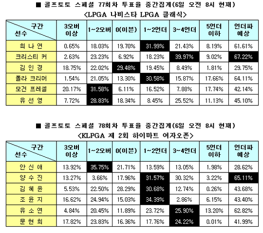 지정 선수별 1라운드 예상 스코어에서는 유소연(25.90%)과 문현희(24.22%)가 3~4언더파, 조윤지(31.57%), 양수진(30.68%), 김혜윤(34.39%)은 1~2언더파를 기록할 것으로 나타났다. 반면 1번 선수로 지정된 안신애(35.75%)는 1~2오버파로 다소 어려운 1라운드를 치를 것으로 내다봤다.