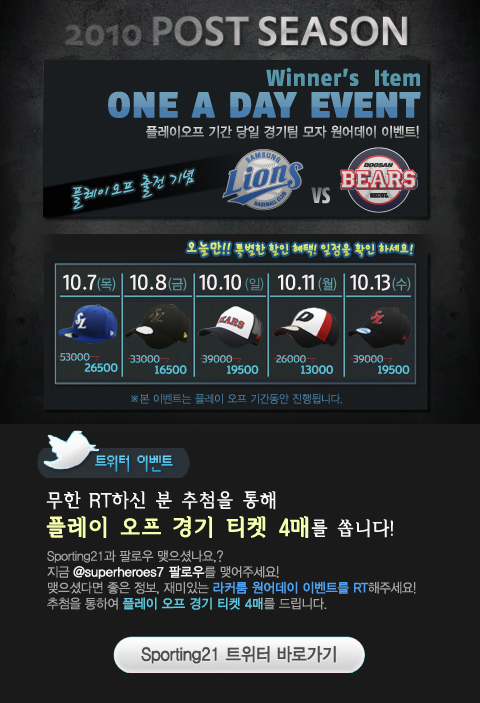 7일 삼성-두산 1차전 당일 24시간 동안 삼성 라이온즈 모자를 반값에 구매할 수 있으며 13일 5차전까지 매일 매일 기분 좋은 반값 할인 타임존이 오픈될 예정이다. 게다가 트위터 이벤트에 참여하면, 플레이오프 3차전 경기 티켓까지 받을 수 있으니 티켓 구하기가 하늘의 별따기만큼 어려운 지금, 기분 좋은 행운을 누릴 수도 있다.