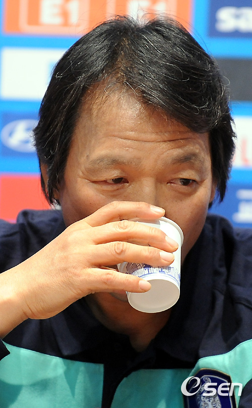 훈련에 앞서 조광래 감독이 인터뷰 중 물을 마시고 있다. /soul1014@osen.co.kr