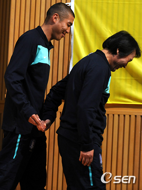 훈련에 앞서 조광래 감독, 이청용, 차두리가 기자회견을 마치고 퇴장하고 있다. /soul1014@osen.co.kr