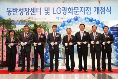 [이브닝신문/OSEN=이성원 기자] IBK기업은행과 LG그룹은 지난 5일 LG 광화문 신사옥 1층에 위치한 기업은행 지점 내에 협력기업 지원을 위한 ‘동반성장센터’를 열었다. 사진은 동반성장센터 개소식에서 윤용로 기업은행장(오른쪽 네 번째)와 조준호 LG그룹 사장(왼쪽 네 번째)이 참석자들과 테이프 커팅을 하고 있는 모습.