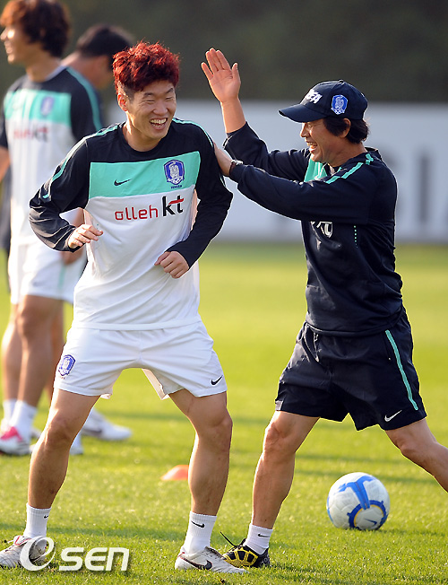 오후 훈련에서 조광래 감독이 박지성과 격려를 하고 있다. /soul1014@osen.co.kr