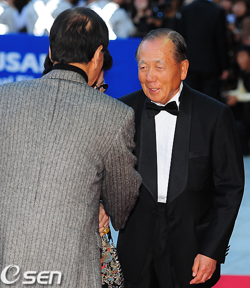 레드 카펫 위에서 김동호 집행위원장이 원로배우들과 악수를 나누고 있다./rumi@osen.co.kr