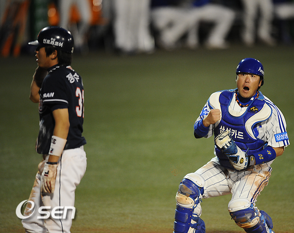 7일 대구 경기장에서 열린 '2010 CJ 마구마구 프로야구 플레이오프 1차전' 삼성 라이온즈와 두산 베어스 경기 1회초 1사 2,3루 삼성 진갑용 포수가 최준석의 플라이 때 태그업한 3루 주자 정수빈을 홈에서 태그아웃 처리시키며 환호하고 있다./ ajyoung@osen.co.kr