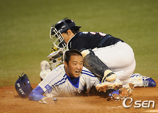 7일 대구 경기장에서 열린 '2010 CJ 마구마구 프로야구 플레이오프 1차전' 삼성 라이온즈와 두산 베어스 경기 3회말 2사 1,2루 최형우 적시타때 2루 주자 채태인 홈까지 쇄도하였으나 두산 용덕한 포수에게 태그아웃 처리되고 있다./ ajyoung@osen.co.kr