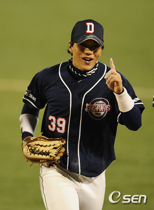 7일 대구 경기장에서 열린 '2010 CJ 마구마구 프로야구 플레이오프 1차전' 삼성 라이온즈와 두산 베어스 경기 5회말 1사 2루 두산 이종욱 중견수가 박석민을 희생플라이 아웃처리 시키며 2루 주자 조동찬까지 포스아웃 시킨뒤 공수교대때 덕아웃을 향하며 미소짓고 있다./ ajyoung@osen.co.kr