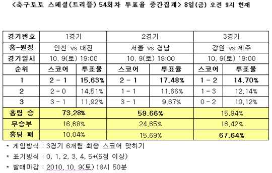 주말 K-리그 3경기 대상 축구토토 스페셜 54회차 투표율 중간집계