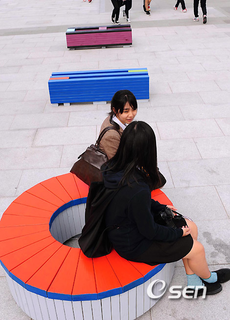카메라를 들고 광화문 광장을 찾은 학생들이 작품에 앉아 다정하게 이야기를 나누고 있다.