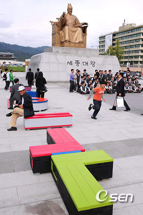 7일부터 10일까지 광화문광장 세종대왕동상 앞에서 벌어지고 있는 ‘한글에 앉기’ 전시회가 그것. ‘2010 한글문화예술주간행사’의 일환으로 기획된 이번 전시회는 눈으로만 보는 것이 아닌, 몸으로 느껴야 제맛이다. 14개의 한글 자음을 기본 디자인으로 의자를 만들었고 이 전시장을 찾는 사람은 누구나 걸터앉을 수 있기 때문이다.