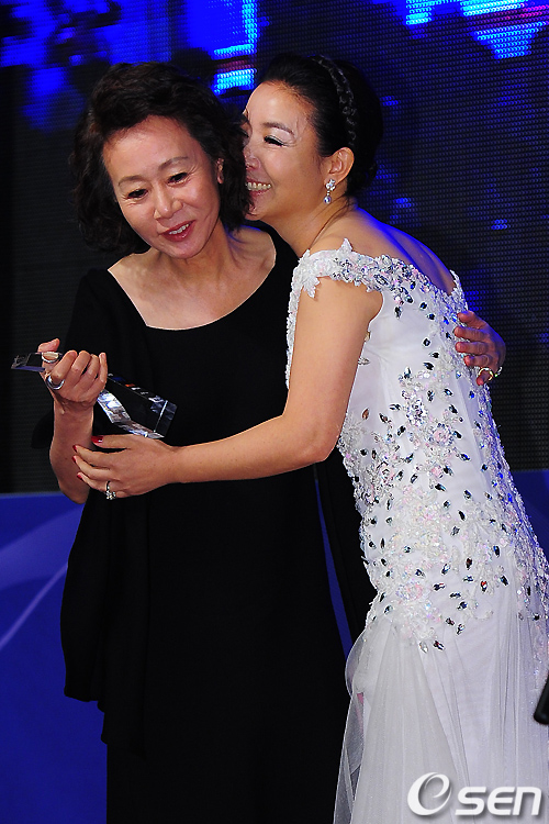 윤여정이 여우조연상을 수상한 후 시상자인 김보연과 포옹을 하고 있다./rumi@osen.co.kr