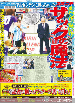특히 일본 언론은 그 동안 6번을 상대했던 아르헨티나에 첫 승리를 거뒀다는 데 주목했다. 닛칸스포츠가 대표적이었다. 닛칸스포츠는 9일 "자케로니 감독이 데뷔전에서 대어를 낚았다"면서 "일본이 아르헨티나와 7경기 만에 첫 승리를 거뒀다"고 보도했다.