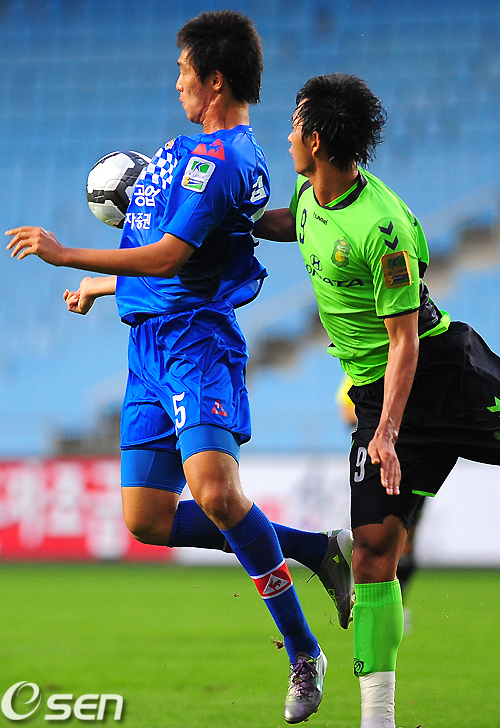 195cm가 넘는 장신 대결서 울산 김신욱이 전북 심우연에 앞서 공중볼을 잡아내고 있다. /jpnews@osen.co.kr